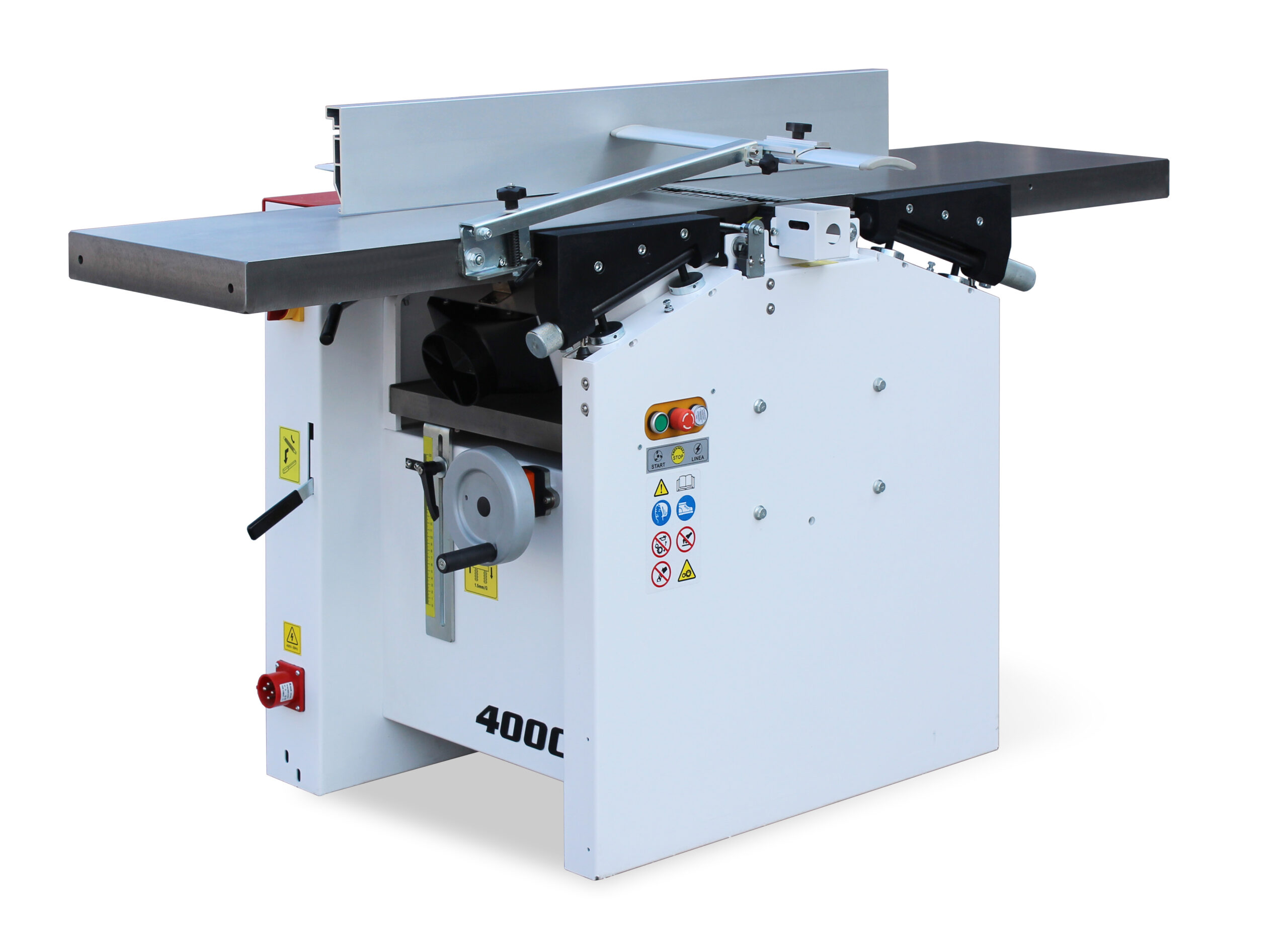 Gekennzeichnet durch das Vorhandensein eines großzügig dimensionierten, unabhängigen, eloxierten Aluminiumhobelanschlags, neigbar und verstellbar, ist die Maschine mit einem Standard-Selbstbremsmotor von 3 PS bei 220 Volt oder 4 PS bei 380 Volt ausgestattet, mit der Möglichkeit, einen Motor von 5,5 PS für spezifische Anforderungen anzufordern.