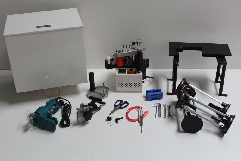 Tragbare Kantenanleimmaschine mit digitalem elektronischem Temperaturregler und variabler Geschwindigkeit. Die Maschine wird komplett geliefert mit: Basissupport für Kantenanleimmaschine Saugnapf-Set zur Unterstützung des Werkstücks Elektrischer Kantenfräser Kantenfräser-Set für gerade Stücke Kantenfräser-Set für gebogene Stücke