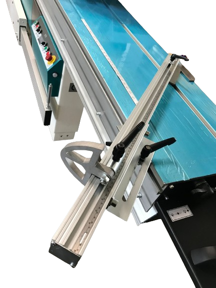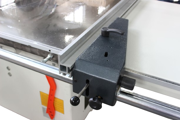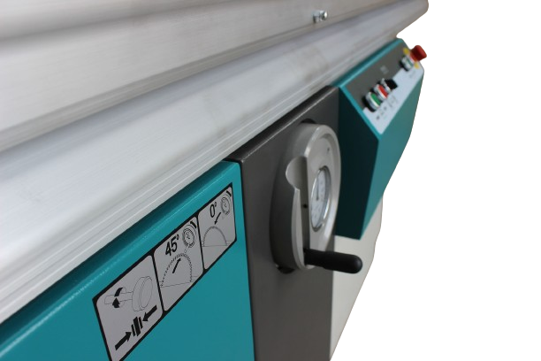 Il carro è di alluminio fresato e anodizzato di grosso spessore, può variare di lunghezza e larghezza secondo il modello o le richieste, corre su carrucole di acciaio temperate-rettificate e barre di acciaio cromato e rettificato. Il gruppo lama è in acciaio normalizzato di spessore 30 mm rettificato, il movimento di inclinazione è calettato su supporti in ghisa sferoidale appoggiati sul basamento e sono di grosso inserimento inclinato. Un volantino con visualizzatore di gradi con battute regolabili.